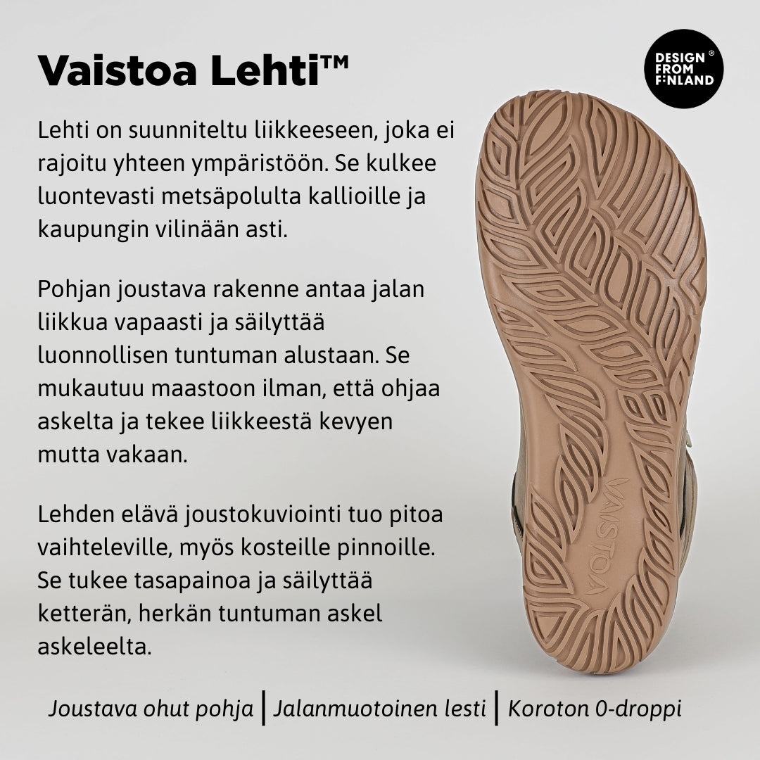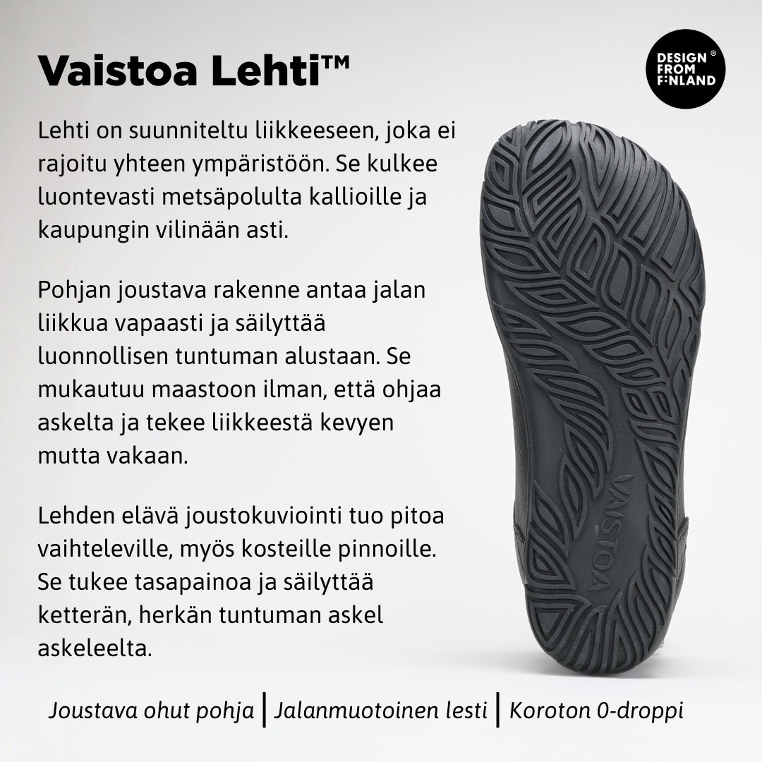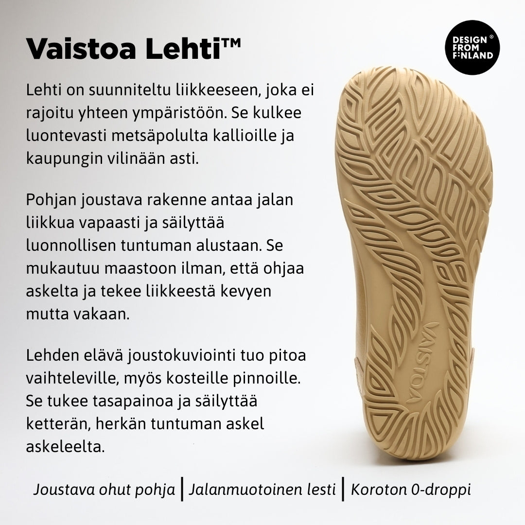 Astuessasi ulos, tunne kuinka jokainen askel on kevyempi ja luonnollisempi. Nauti paljasjalkakengän tuomasta vapaudesta ja siitä, kuinka voit tuntea maan muodot jalkojesi alla.