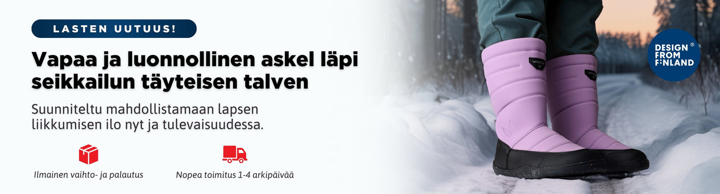 Useimmat lasten talvikengät pitävät jalat lämpiminä, mutta samalla ne rajoittavat jalkaterän luonnollista toimintaa. Kun liike estyy, pienet lihakset eivät vahvistu ja hermoston hienovarainen yhteistyö heikkenee – mikä voi vaikuttaa koko kehon tasapainoon ja liikkumisen varmuuteen.